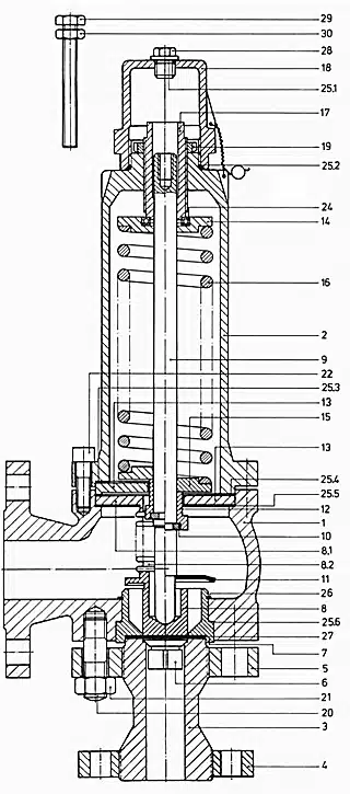 Entfernen Sie die Verschlussschraube (28). Schrauben Sie die Halteschraube (29) mit der Mutter (30) durch die Kappe (18) in die Druckstange (9) ein und ziehen Sie die Mutter von hand an. Lösen und entfernen Sie die Schraube (21) vom Gehäuseunterteil. Entnehmen Sie den Sitz (3) und Kegel (6) aus dem Gehäuseunterteil. Achten Sie darauf, dass der Kegel dabei nicht aus dem Ventilsitz fällt.